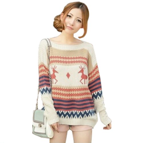 Luckshop2012 Tricot pour femme Pull Pull Top col rond manches longues de Noël (Beige)
